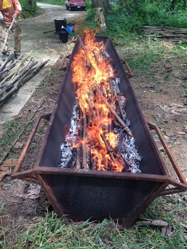 The barrel oven is useful for small feedstock, but cannot handle large tree limbs, bamboo, etc. so Warm Heart designed the Flame Cap Trough. This method is a great additional tool for making biochar.