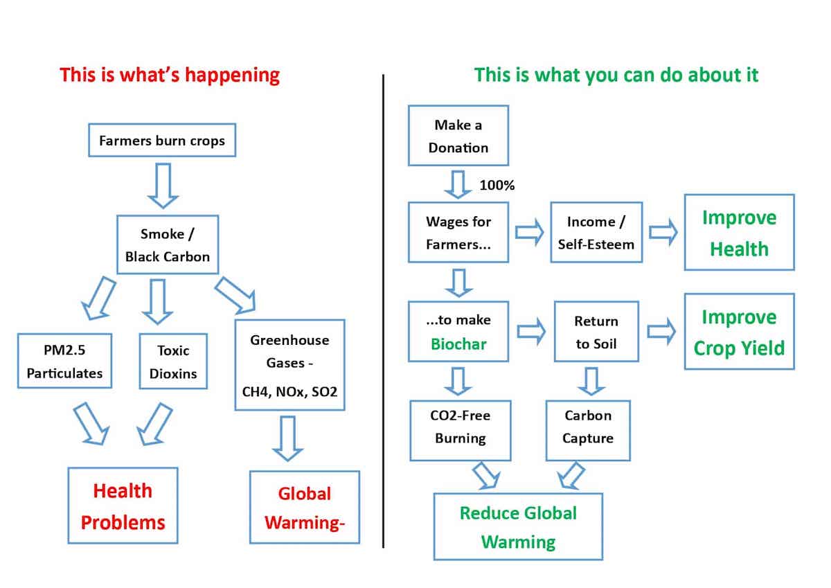 Reduce your carbon footprint by supporting Biochar Carbon Removal to train more farmers how to turn crop waste into biochar, reduce CO2 emissions AND remove carbon by sequestering the pure carbon back into the earth.